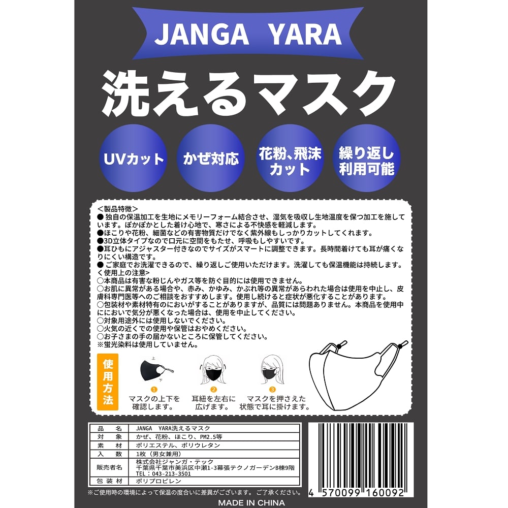 JANGA YARA洗える 冬用 マスク (1枚入り)